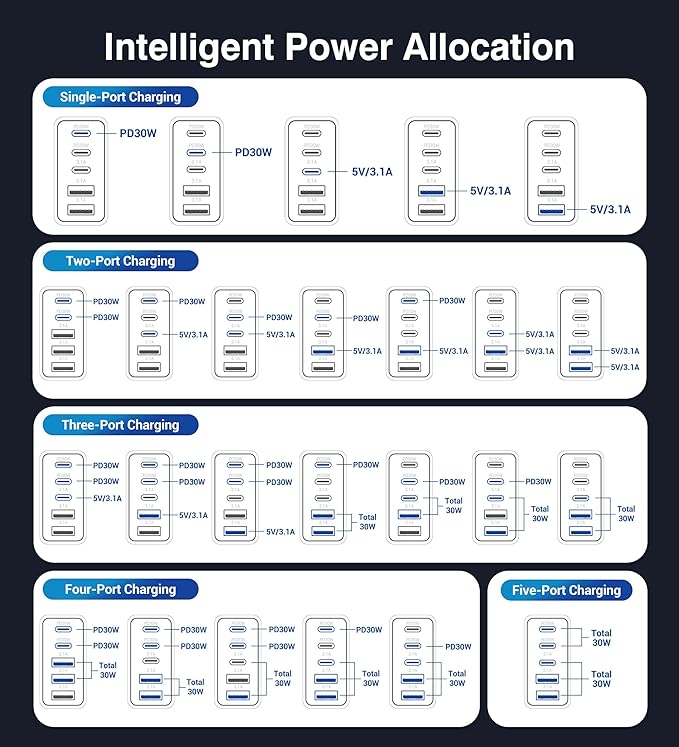 - 5 IN 1 USB Charger Block with Multiple Ports: This USB Power Block featuring 3 USB-C ports + 2 USB-A ports. This design allows users to conveniently charge their phones, tablets, cameras, power banks, and various devices. When all 5 devices are connected, power distribution among the ports ensures efficient charging, minimizing wait times. Moreover, this charging cube saves space by consolidating the charging needs into a single device, eliminating the need for multiple wall sockets.