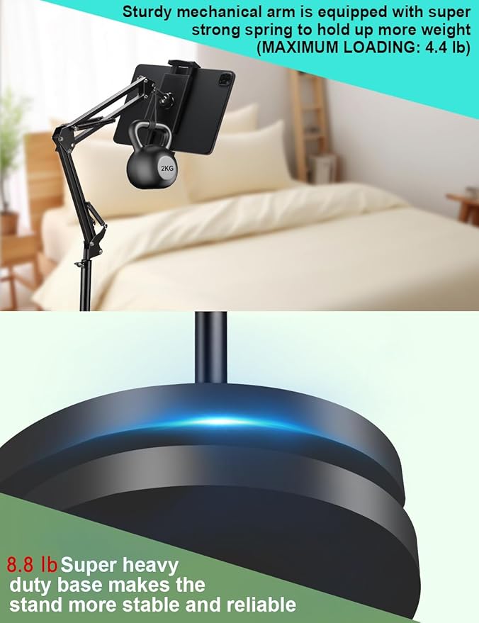 Tablet Floor Stand, Overhead Bed Phone Stand with 8.8 lb Super Stable Base & Angle/Height Adjustable, Compatible with 4.5''-13'' iPhone, iPad Pro 12.9, Galaxy Tab, Kindle, Phones