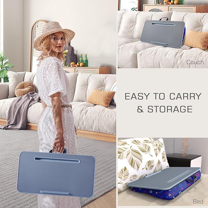 - LIGHTWEIGHT & PORTABLE: This lap desk for laptop with cushion is designed with a durable handle that makes it easy to carry and weighs 3.5 pounds. Take the lap desk with you to the library, dorm, office, and airport for a pleasant experience. Ideal for adults, College students, etc.