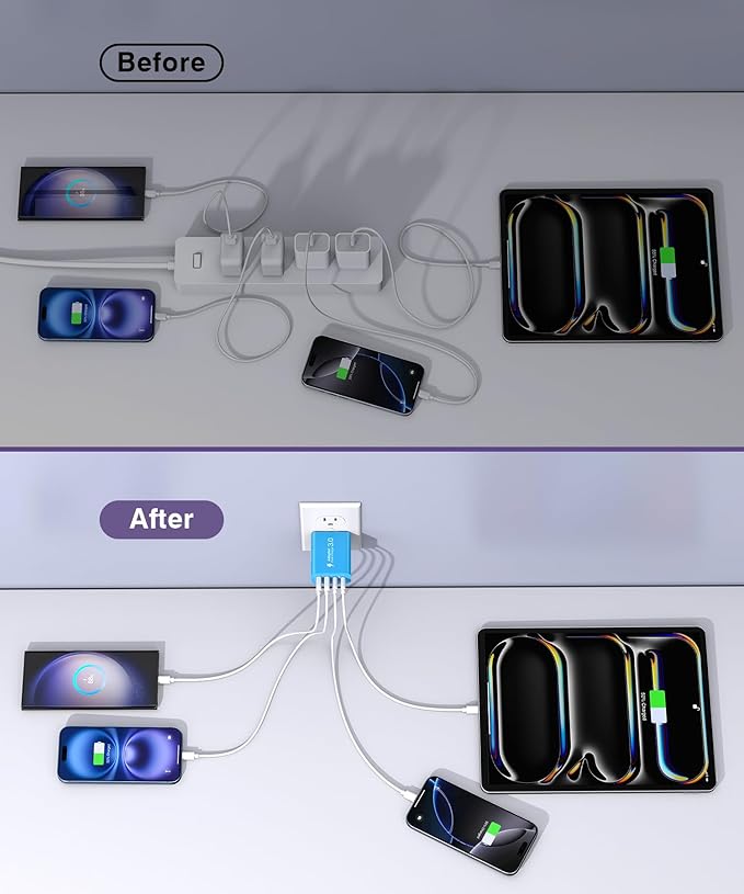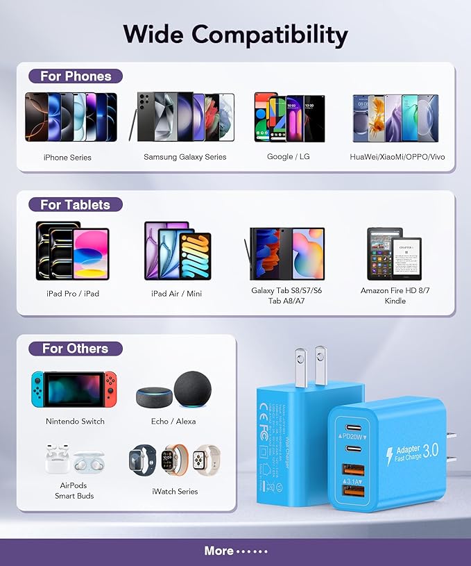- Universal Compatibility Wall Charger: Due to the special 4-port,the USB charger is compatible with almost all electronic devices,charging adapter for iPhone 17/17 Pro/17 Pro Max/16/16 Pro/16 Pro Max/16 Plus/15/15 Pro/ 15 Pro Max/15 Plus/14/14 Pro/14 Pro Max/13/13 Mini/13 Pro Max/12/12 Pro Max/12 Pro Max/12 Mini/SE 2020/11/11 Pro/11 Pro Max/XR/XS/X/8/7,iPad Air/Pro/Mini,Samsung Galaxy S22/S21/S20/S10/S9/S8/A12/A13/A22/A32/A52/A53/A71/Note 20 10,Tablets,LG,Motorola,Google Pixel and other digital devices compatible