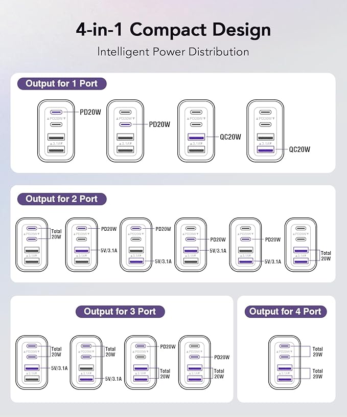 - Universal Compatibility Wall Charger: Due to the special 4-port,the USB charger is compatible with almost all electronic devices,charging adapter for iPhone 17/17 Pro/17 Pro Max/16/16 Pro/16 Pro Max/16 Plus/15/15 Pro/ 15 Pro Max/15 Plus/14/14 Pro/14 Pro Max/13/13 Mini/13 Pro Max/12/12 Pro Max/12 Pro Max/12 Mini/SE 2020/11/11 Pro/11 Pro Max/XR/XS/X/8/7,iPad Air/Pro/Mini,Samsung Galaxy S22/S21/S20/S10/S9/S8/A12/A13/A22/A32/A52/A53/A71/Note 20 10,Tablets,LG,Motorola,Google Pixel and other digital devices compatible