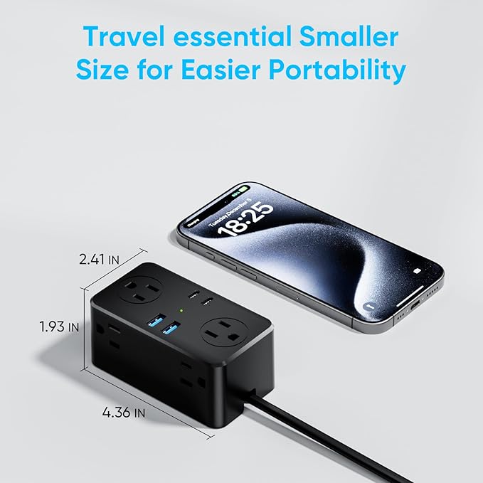 - 3ft Extension Cord can be cleverly wrapped around the bottom of the power strip. Easy to store, compact size (4.36*2.41*1.93 inches), lightweight, portable to carry, suitable for a business trip and travel