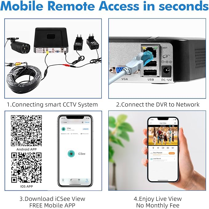 - 【 Local or Remote Access & Free APP Alerts push 】When motion is detected, our motion technology will send you alerts on your mobile devices instantly.Remotely access and play surveillance footage and control the security DVR with no contract or monthly fees with app.View and control your security system locally by connecting the system to a monitor without internet, or via free VMS Client software on tablet, PC, or via Smartphone APP (XMEye or icsee ) on mobile devices remotely.