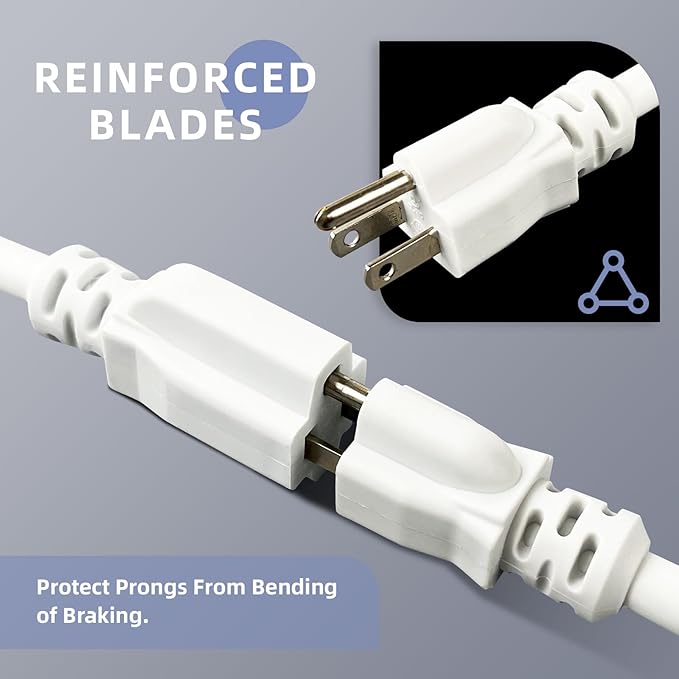 - 【Safe Cable】- UL Listed, 3 prong grounded plug for added safety. Reinforced blades protect prongs from bending or breaking. Remain flexible and tangle-free under all weather conditions and wouldn’t become stiff or crack in cold weather.