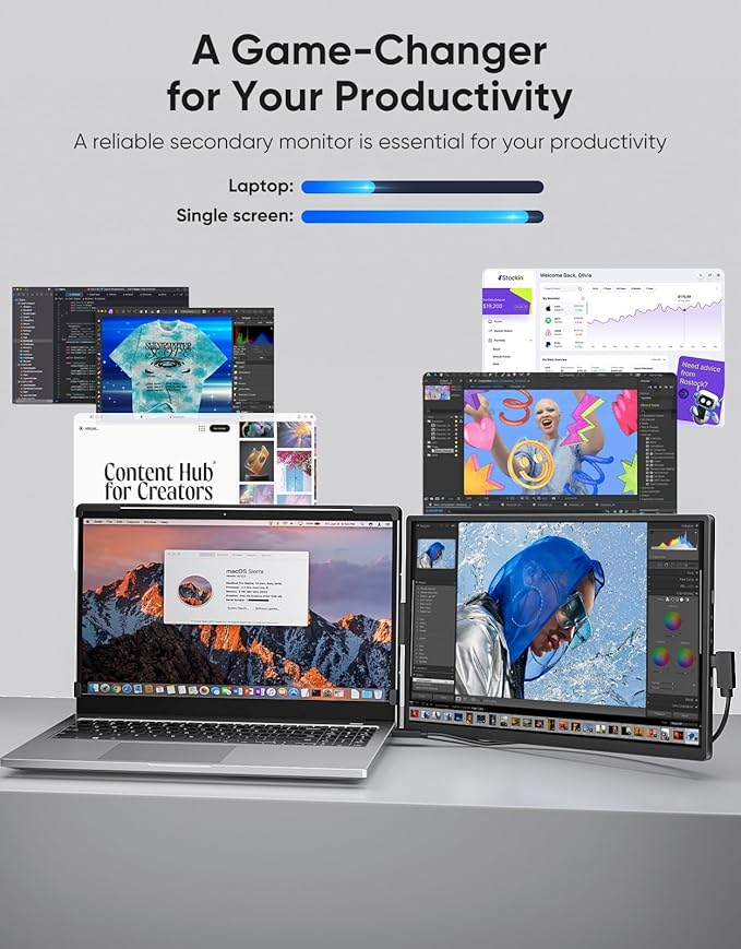 - Boost Productivity by 200% On the Go: Due to a decent size, detachable and foldable design, Dopesplay dual screen monitor for laptop offers you fits easily into your travel backpack. Easy to carry and install. The vertical/ horizontal screen positions provide more convenience for your daily work. A must have for work travel if you are used to multiple screens