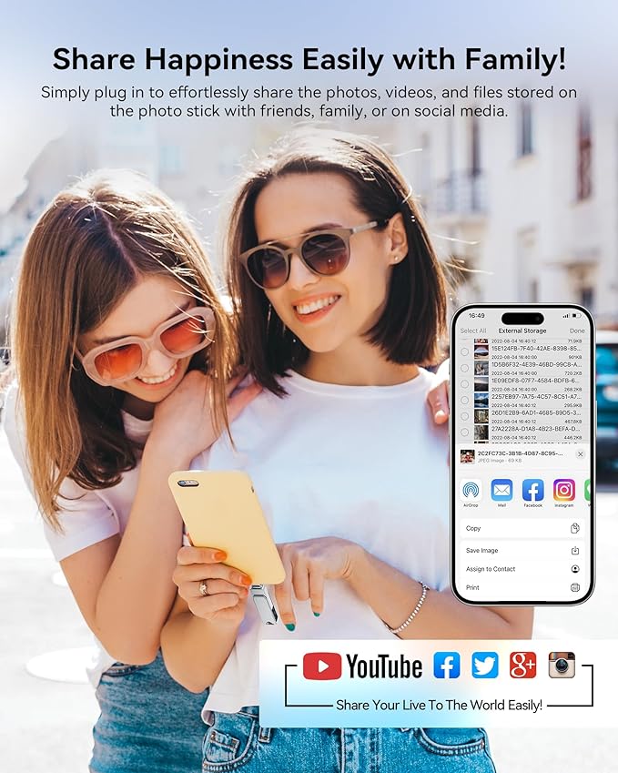 - High-speed one-click backup: The reading speed of the photo stick is up to 80mb/s, and the writing speed is up to 40mb/s, which can quickly back up files/photos/videos and phone books, etc. You can also store photos on the computer through the usb port for double insurance. It's worth mentioning that you can share files to social media (Facebook, Twitter, etc.) directly from the jump drive. Easily share data with family and friends, making entertainment and work more fun!