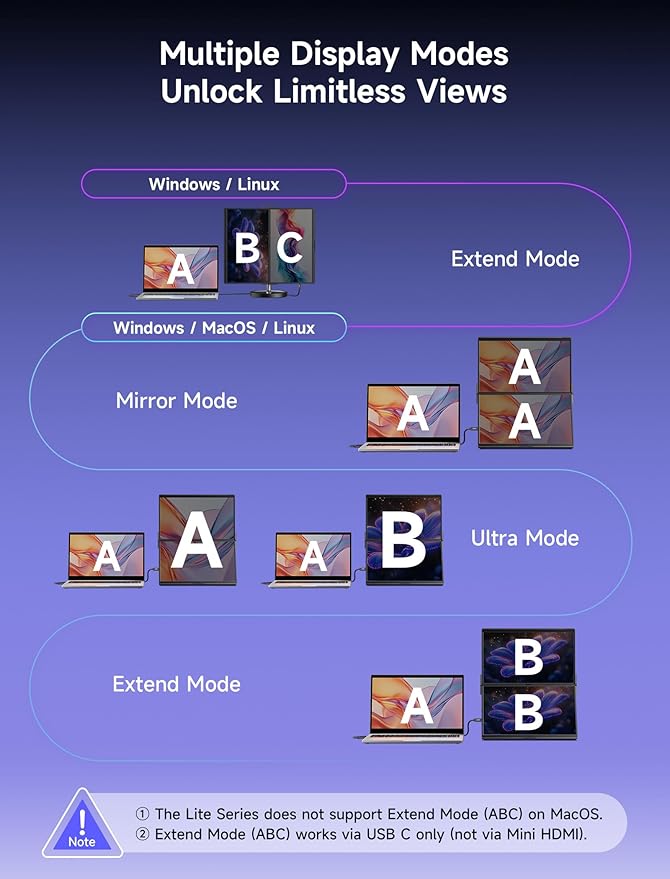 - 【Unlock Endless Possibilities】Explore three display modes with the FlipGo Lite 15.6" dual laptop screen extender: 1. Ultra Mode for expansive views, 2. Mirror Mode for overlapping multitasking, 3. Extend Mode for side-by-side work. [Note: macOS does not support extended (ABC) mode. Mode support varies by system and port. See product images for details or contact our support team.]