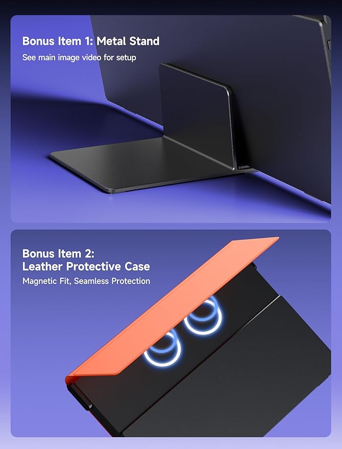 - 【Upgraded Magnetic Design】 The FlipGo portable monitor's back panel features a magnetic design, facilitating better attachment of stands and other accessories. It is also equipped with four sets of N52 strong magnets to ensure both portability and stability of connections. JSAUX has designed four stands specifically for the FlipGo series monitors, offering customers more choices. The unique design of the stands saves space, effectively protects the eyes and neck, and enhances focus. (Note: The stands are sold separately.)