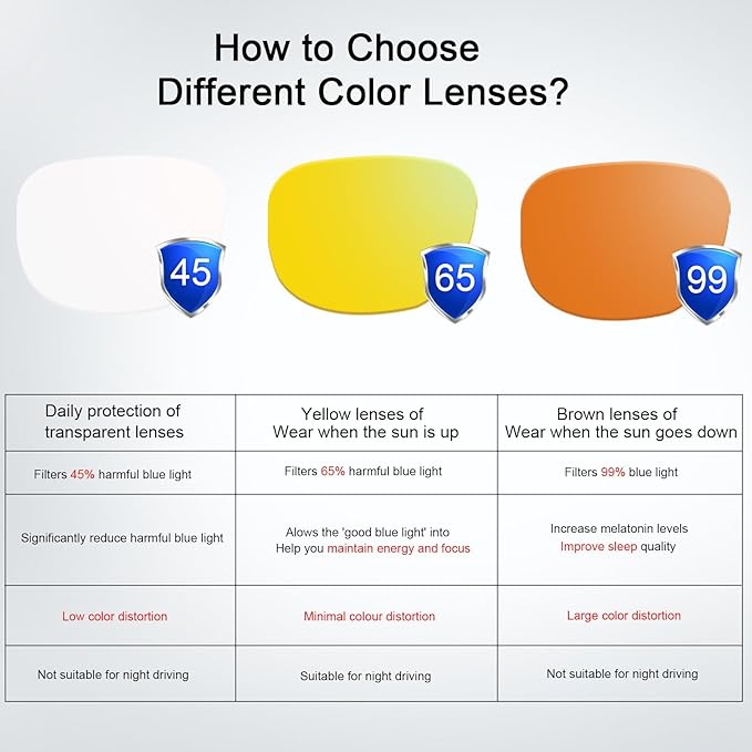- 【Blue Light Filter Yellow Lenses】Anti blue light filter glasses, 65% Blue Block Rate.an block up to 65% harmful rays between 380nm-500nm. Alleviating eye fatigue, suitable for wearing both during the day and night, ideal for wearing while playing computer games.The blue light filter glasses specifically designed to help you sleep by blocking harmful blue light that lowers melatonin levels.