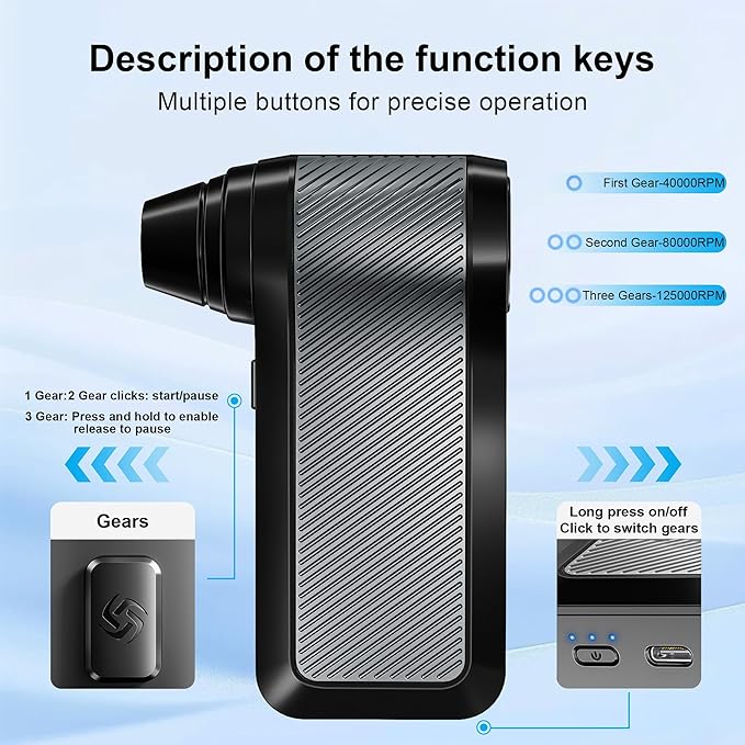 - Electric Air Duster - Our air duster features 3-speed adjustable airflow and interchangeable nozzles, catering to various cleaning tasks with efficiency. It boasts a built-in large-capacity battery with temperature, current, and short circuit protection, supporting rapid 10W charging.