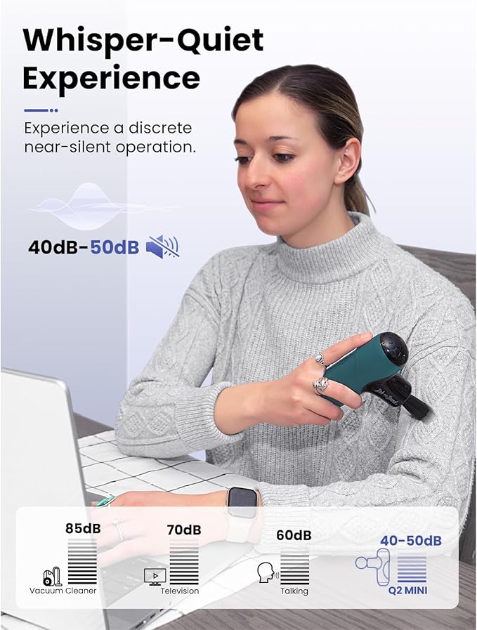 - The Most Compact Design Ever: Q2 Mini Massage Gun combines power and portability (5.7”L x 3.4”W x 1.8”H, 0.95lb/0.43kg) in a truly pocket-sized design. Its lightweight, ergonomic design ensures ease of use, while the quiet yet powerful motor provides targeted relief anytime, anywhere. Fits easily in handbags, gym bags, or luggage. Perfect for athletes, office workers, or anyone seeking on-the-go recovery, the Q2 Mini is your ultimate companion for professional-grade therapy in a compact form.