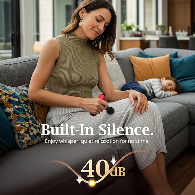 - Whisper-Quiet (<40dB) with 90-Min Fast Charge – Designed for moms and light sleepers, this ultra-quiet massage gun operates at library-level volume (<40dB), so you can enjoy bedtime muscle therapy or naptime use without disturbance. The brushless motor delivers powerful yet silent therapy. With 15W USB-C fast charging, a 90-minute charge provides 4 hours of continuous use - perfect for busy schedules. Smart power management ensures consistent deep tissue massage anytime.