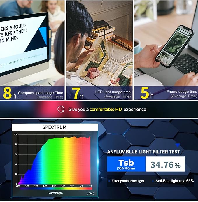 - 65% Blue Light Blocking Rate: ANYLUV Blue light Blocking Glasses can block up to 65% harmful blue light. These anti eye strain computer glasses are effective in relieving visual fatigue. Prevents dry eyes and protects them from blue light rays. Computer glasses men can be worn both during the day and at night. Especially great for people who like to play games in front of their computer