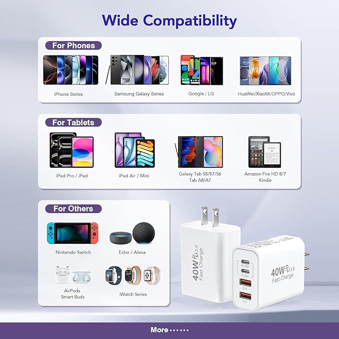 - [Universal Compatibility] The compact multi-port charging block is almost compatible with all electronic devices and for iPhone 17/17 Pro/17 Air/17 Pro Max/iPhone 16/16e/16 Pro/16 Plus/16 Pro Max/iPhone 15/15 Pro/15 Plus/15 Pro Max/iPhone 14 Pro/14 Pro Max/14 Plus/iPhone 13 Pro/13 Pro Max/13 Pro Max/13 Mini/iPhone 12/12 Pro/12 Pro Max/12 Mini/11 Pro/11 Pro Max/XS Max/XR/X/8,iPad Pro/Air/Mini,Galaxy S25/S24/S23/S22/A12/A13/A22/A32/A52/Note 20/10/Z Fold 7/6/Z Flip 7/6,LG,Google Pixel,Tablet,etc