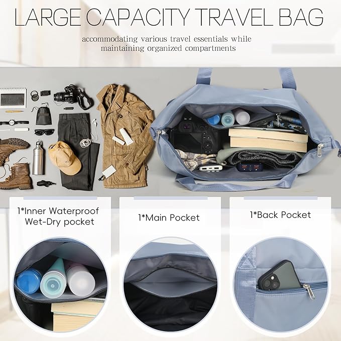 - 【Large Duffle Bag for Travel with Various Compartments】 The weekender bags for men and women has 1 main compartment with 1 inner zip wet pocket, and 1 back luggage sleeve pocket, this foldable travel bag can be the travel duffel bags for women and men that provides ample space for your larger items and clothing, or be a large gym bag allowing to keep wet or soiled items separately, also be a airline approved personal item bag, stored this tote bag in the overhead compartments or under the seat