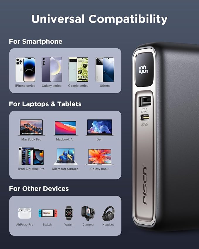 - [Wide Compatibility]: PISEN 10000mAh 2-in-1 hybrid charger is portable and suitable for travel, working flawlessly with a wide range of devices including phones, tablets, laptops, and more. You can even share the convenience it offers with your fellow travelers.