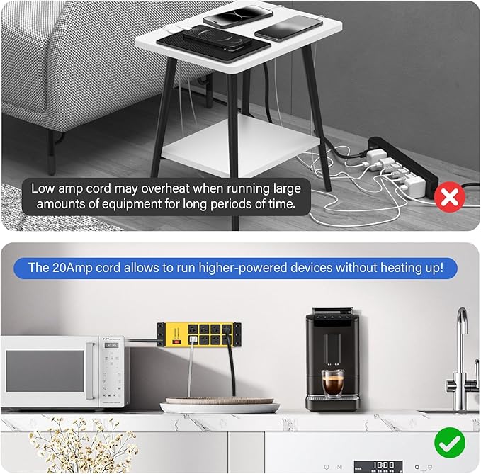 - 12 gauge 6ft heavy cord, rating: AC 20A 125V 2500w. If you are running a lot of equipment for long periods of time or fully loaded 15A equipment, and without overheating.