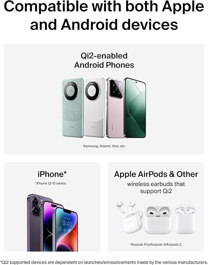 - FAST CHARGE plus THE LATEST QI2 TECHNOLOGY: Conveniently place your phone on the magnetic charger to fast charge your iPhone, Samsung, or Qi2 compatible device up to 15W. With Qi2, you get up to 2x faster wireless charging.