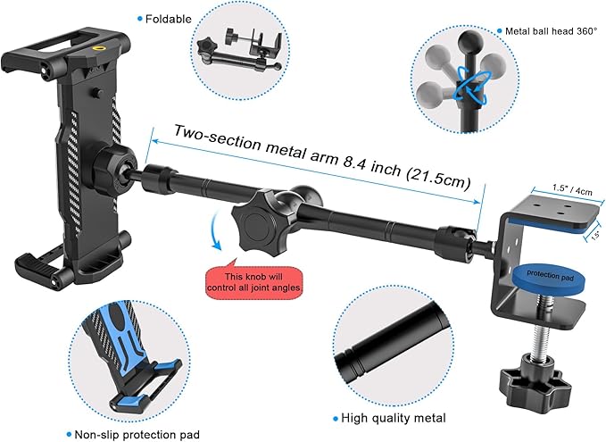 - 【Broad Compatibility】Table tablet stand fit for all 6"-14.6" screen phones and tablets, such as compatible with new iPad Pro 9.7/ 10.5/ 11/ 12.9, iPad Air, iPad Mini, iPhone 11/ 12/ 13/ 14/ 15 Pro Max, Galaxy Tab Ultra/ Surface Pro Go/ Switch and more tablets and phones with or without a case. Additionally, the clip comes with a standard 1/4" screw, making it perfect for small cameras, webcams, lights, etc.
