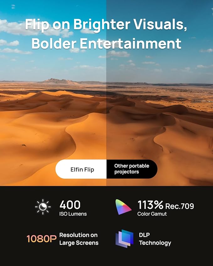 XGIMI Elfin Flip Portable Projector, 1080P Resolution Outdoor Projector, Licensed Netflix, Build-in Adjustable Stand, Lightweight and Compact Design, 400 ISO Lumens, Screen Adaption