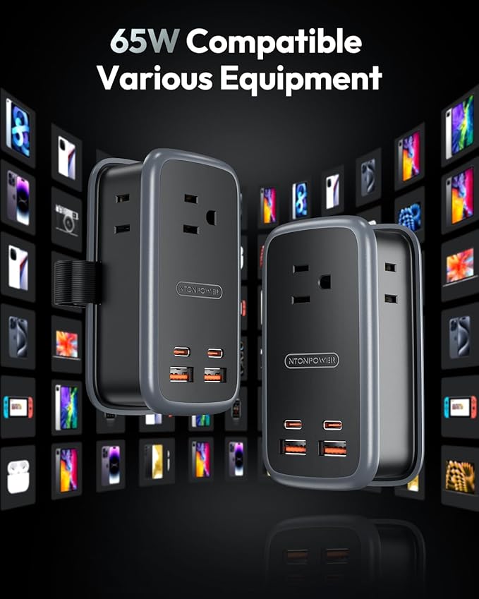 - 【GaN 65W PD Super Fast Charger】:NTONPOWER power strip built in the latest GaN technology, supports a maximum 65W output, a 65W charger quickly charging devices like the MacBook Pro, smartphones, and tablets. Charge your MacBook Pro 14" to 50% in just 37 minutes. Stay powered on the go