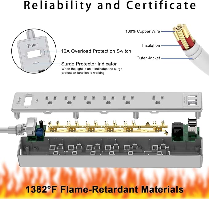 - Power Strip with 6 Outlets & 3USB Ports: 6 AC Surge protector outlets(1680 Joules) including 1 Widely Spaced Outlet, 2 USB-A Charging Ports and 1 USB-C Charging Port (Total 5V/3.0A, 15W) , 10 feet power cord (1250W/10A), Surge protector indicator and 10A Overload Protector switch protects against spikes and fluctuations.Wide range voltage design, can be used on 120v to 240v circuit.