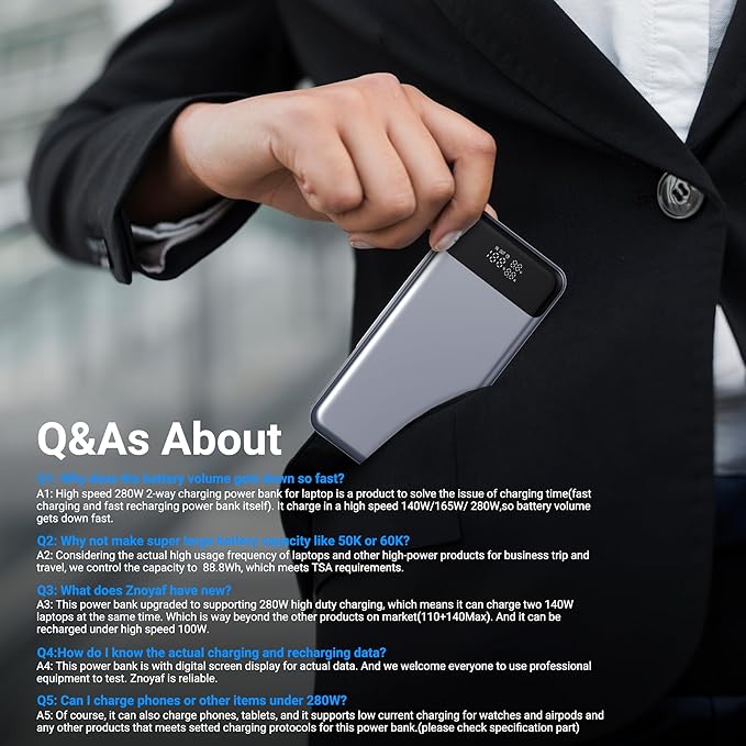 - [What You Get] 1*280W power bank, 1*6A fast charging cable, 1*user guidance. Znoyaf with professional technical support and friendly 24-month worry-free customer service to ensure users have a satisfactory experience