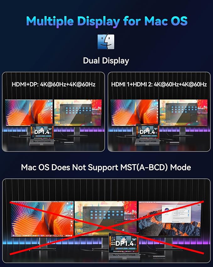 - 8K Docking Station 3 Monitor: This dual HDMI usb c hub support dual monitors will be 4K@60Hz and 4K@60Hz(DP1.4). Triple displays will be 3*4K@60Hz((DP1.4 Source). While single using HDMI port or displayport resolution up to 8K@30Hz or 4K@120Hz resolution. you can enjoy an 8K ultra high definition movie experience and 3D visual effects.NOTE: MacBook laptops only support same image on external monitors. (The hub Not Support Using Converter)