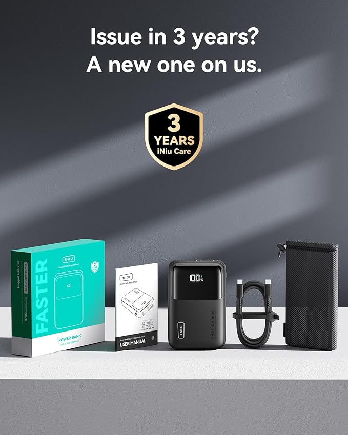 - What You Get: INIU 20000mAh power bank*1, 100W USB-C to USB-C Cable 1ft*1, welcome guide*1, industry-leading 3-Year iNiu Care, plus lifetime technical support.