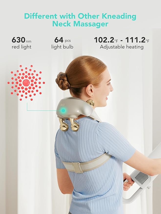 - Larger Massage Area and Heating Area - SKG Portable massager adopts a micro-swinging elastic massage head design, which fits the entire shoulder and neck in a three-dimensional manner, providing a larger massage area and fits larger neck sizes.H7 ultra has 64 red light beads + 2826 square millimeters of film hot compress, double-effect hot compress, providing a larger heating area.(Please do not use the highest heating level for a long time to avoid skin burns)
