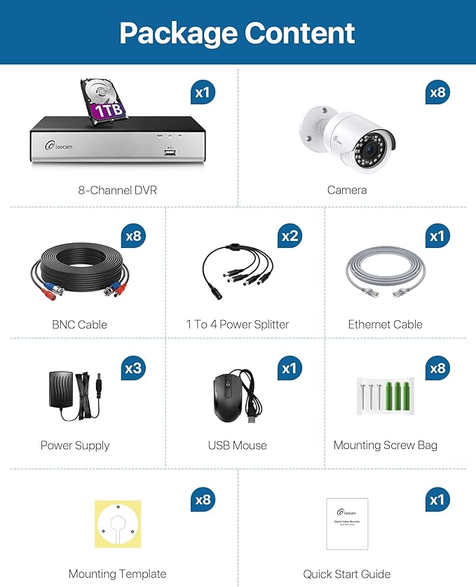 - 2MP HD Day&Night IP66 Camera System: The Loocam 1080P HD DVR Security Camera System captures video both day and night. Equipped with 24 infrared LEDs, it delivers night vision up to 80ft, ensuring your home is protected even in the darkest hours. The 8-channel wired DVR CCTV system includes 8pcs IP66 weatherproof bullet cameras, providing comprehensive coverage for both indoor and outdoor areas.