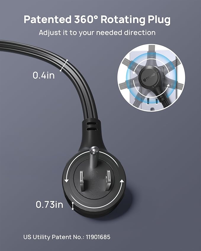 - Patented 360° Rotating Flat Plug: Built with a swivel wall plug(0.73in thickness), the short extension cord provides convenient access to any weird wall socket from all directions. Versatile for use in small spaces, behind furniture or other hard-to-reach outlets. US Utility Patent No.: 11901685