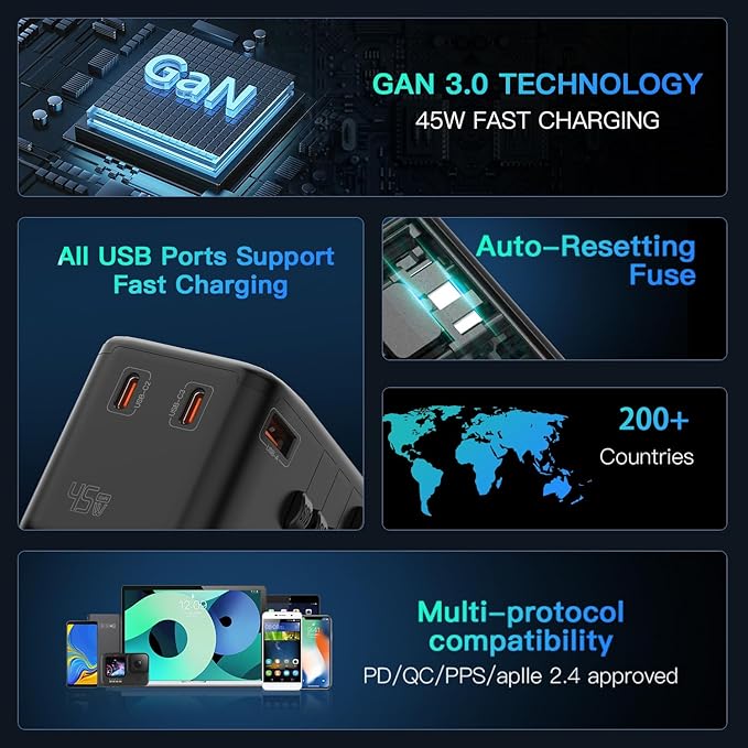 - TRAVEL CHARGER FOR MULTIPLE DEVICES: HAPOW travel adapter with 1 universal AC port, 3 USB-C ports(GaN PD 45W), 1 USB-A ports(QC 45W). Thanks to the advanced GaN 3.0 technology, it has a better charging performance of up to 45W and generates less heat