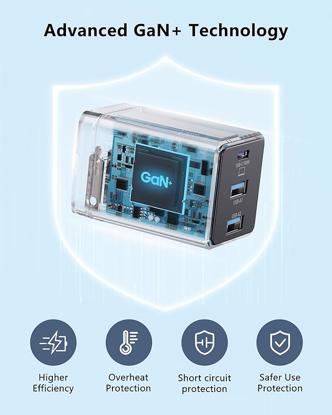 - GaN Ultra Chip Technology for Efficient and Safe Charging: GaN Ultra Chip Technology for Efficient and Safe Charging: Our USB C GaN charger features advanced GaN Ultra chip technology, providing fast and efficient charging in a compact design. With up to 95% energy efficiency, it includes multiple protection features-flame retardant, over-current, over-voltage, overcharge, overload, overheat, and short circuit protection-ensuring complete safety for you and your devices.