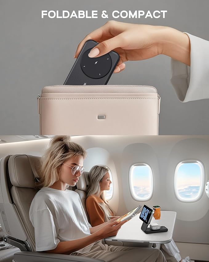 - Foldable and Travel-Friendly: This foldable 3-in-1 for MagSafe power bank fits effortlessly in your purse or pocket, replacing tangled cords and bulky chargers. Whether youβre traveling or on a business trip, it powers all your devices while taking up minimal space, making it the perfect all-in-one travel accessories.