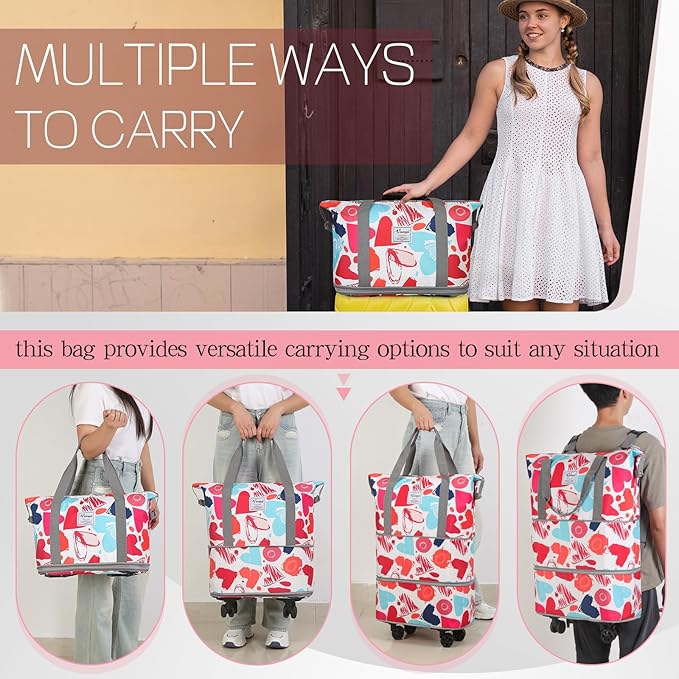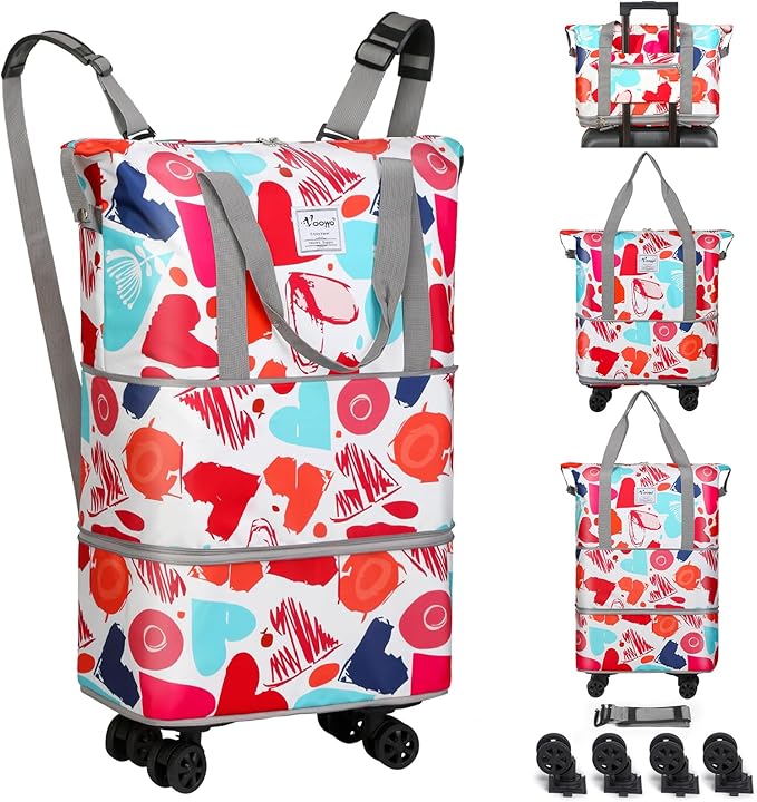 VOOWO Rolling Duffel Bag with Wheels - Foldable Expandable Duffle Bag with Wheels for Travel, Rolling Luggage Bag Wheeled Carry On Bag, Large Rolling Backpack Weekend Bags for Men Women (Love)