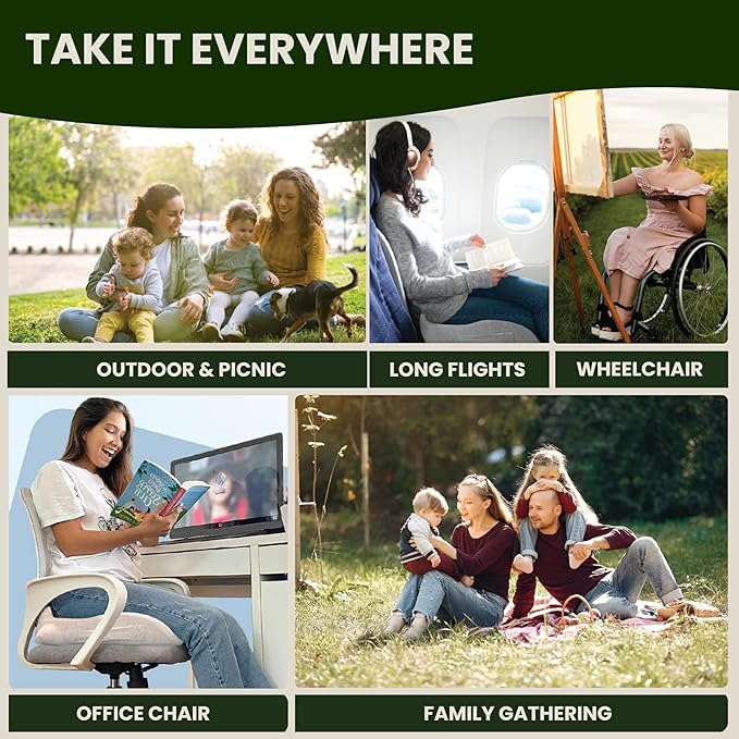 - PORTABLE DESIGN WITH BUILT-IN HANDLE Take it anywhere with the built-in handle. This computer chair cushion fits perfectly on office chairs, car seats, gaming chairs, and wheelchairs β delivering consistent ergonomic support and pressure relief in any setting.