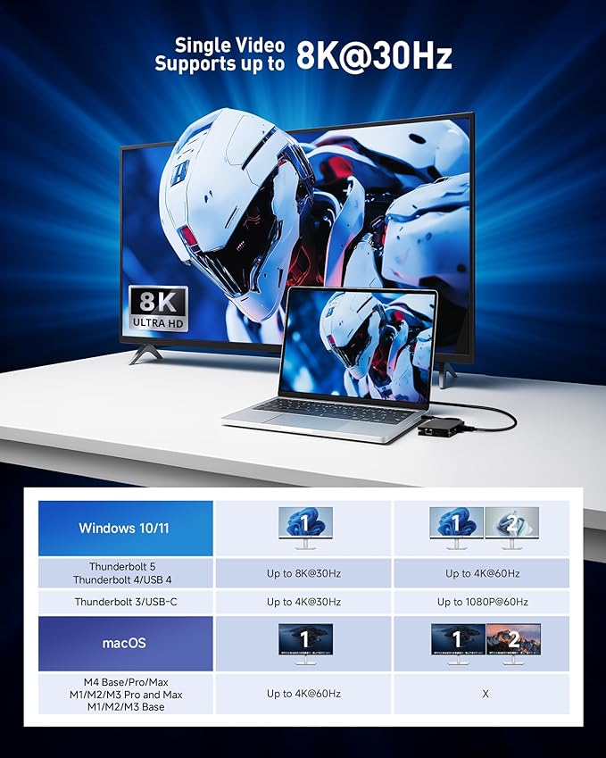- Dual HDMI for UHD 4K@60Hz Video: Enjoy immersive, high-quality video with the USB C docking station dual HDMI ports. HDMI 1 supports single 8K@30Hz /4K@120Hz or dual 4K@60Hz for vibrant visuals across multiple displays. HDMI 2 supports single or dual 4K@60Hz. Whether you're streaming, gaming, or working, the USB C hub dual HDMI capability offers incredible video output for a seamless multi-monitor experience.