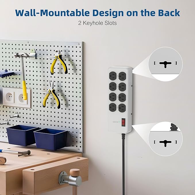 - Effortless Installation and Storage: This wall mountable power strip with switches features a hanging hole design, making it super convenient for any workspace. Use the hanging hole for storage addresses the need for a workbench or garage power strip wall mount, ensuring a tidy and accessible work area.