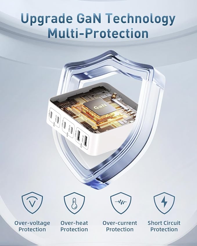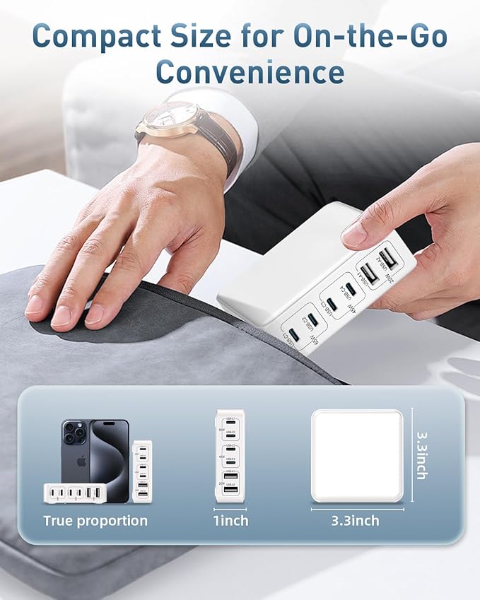 - 【130W Super-Fast Charging – More Power, Less Waiting】65W USB-C (C1/C2): Charge your MacBook Pro 13” to 50% in just 30 minutes.45W USB-C (C3/C4): Boost your iPhone 16 Pro Max from 0 to 50% in only 25 minutes. Total 130W Output – Ensures simultaneous fast charging for multiple high-power devices. Designed for busy professionals, students, and families who need quick, reliable charging throughout the day.