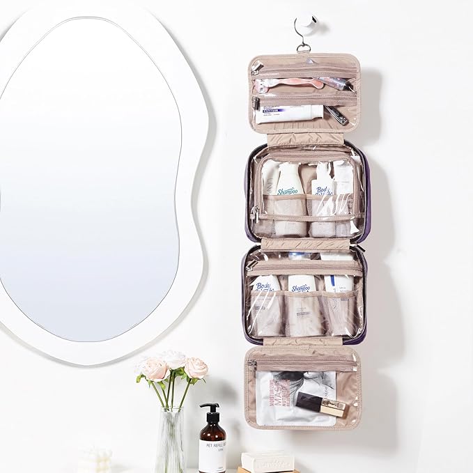 NISHEL Travel Toiletry Bag for women, Portable Hanging Organizer for Travel-Sized Shampoo, Conditioner, Brushes Set, Makeup Accessories, Medium Size, Purple