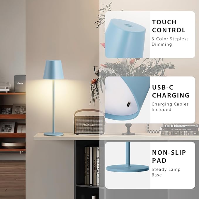 Kakanuo Cordless Table Lamps Pack of 4, Portable LED Desk Lamp, Battery Operated Lamp, Wireless Rechargeable Lamp, 3 Color Stepless Table Lamp for Restaurant, Bar, Party, Camping and Bedroom - Blue