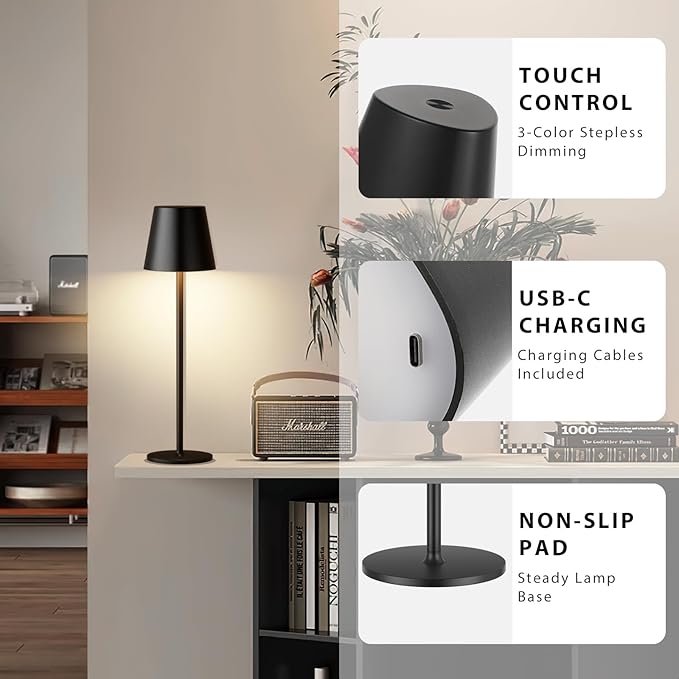 - 3 Color Temperatures Touch Lamp: The black cordless desk lamps are available to turn ON/OFF and switch the 3-color lighting modes by touching the button on the top of LED wireless lamp. Tap to change 3 color temperatures of lighting: 3000K warm white, 4000K natural white, 5000K daylight white. And long press the touch button to adjust the stepless brightness for each color lighting from 10% to 100% (With lighting memory function)