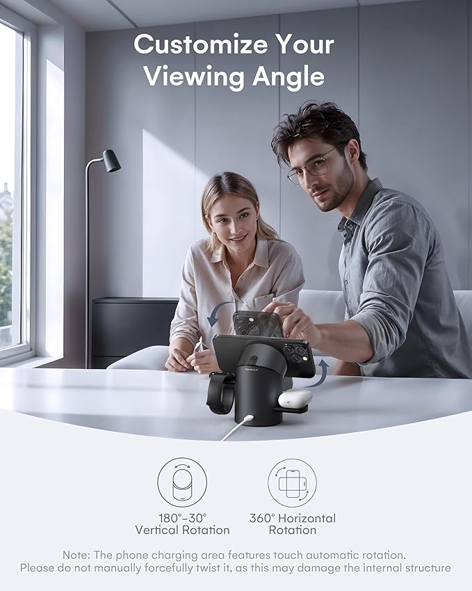 - Smart Touch Control: Experience effortless operation with this iPhone charging station featuring instant touch activation, The rotating phone charging area that doubles as a phone stand, allowing for easy viewing while charging. The charging docks for your AirPods and Apple Watch pop up with a press, saving space and keeping your setup organized when not in use.