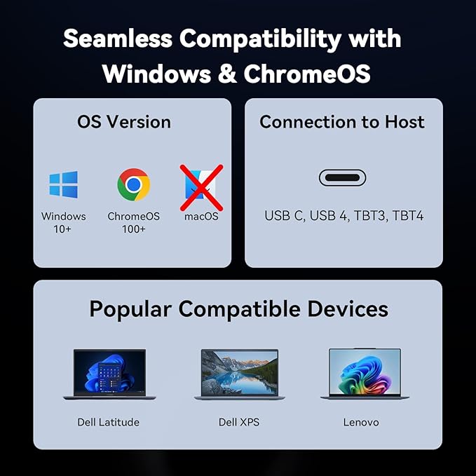 - Compatible Devices : Please ensure your laotio supports full-featured USB-C, USB4, and Thunderbolt 3 / Thunderbolt 4 systems running Windows 10 / 11 & ChromeOS 100 or newer including, HP ProBook / EliteBook / Spectre x360 series, Dell XPS / Latitude series, Lenovo ThinkPad / IdeaPad / Yoga , Microsoft Surface Pro / Go / Book / Laptop models, LG Gram, Thousands of other laptops which are compliant with full-featured, standards-compliant USB-C ports Please ensure your laotio supports full-featured USB-C, USB4, and Thunderbolt 3 / Thunderbolt 4 systems running Windows 10 / 11 & ChromeOS 100 or newer including, HP ProBook / EliteBook / Spectre x360 series, Dell XPS / Lat⦠See more