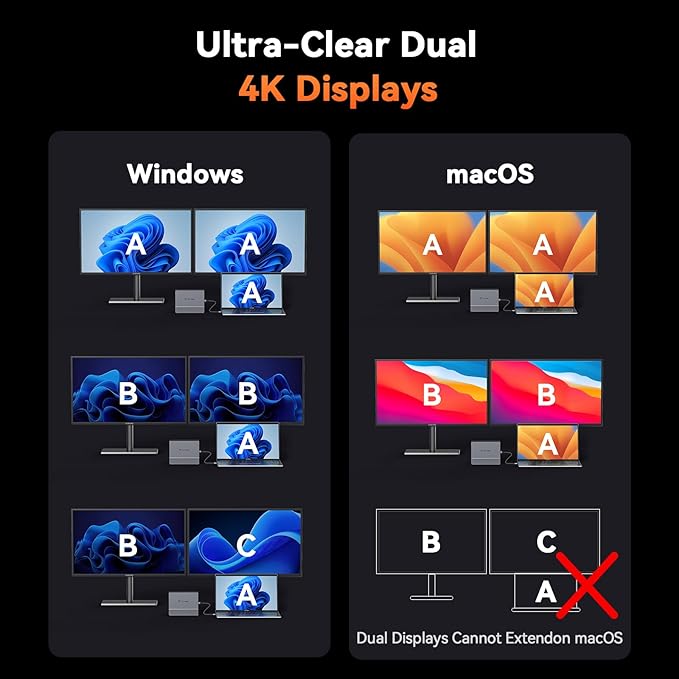 - Dual 4K@60Hz Display for Enhanced Visuals-Enhance your workflow with 2x 4K HDMI ports for ultra-high-definition visuals. Whether youβre multitasking, editing graphics, or enjoying movies, this dual display docking station ensures sharp, vibrant images for an immersive viewing experience that boosts productivity and entertainment alike