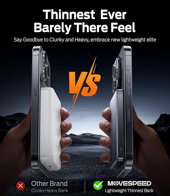 - 【Slim & Portable, 10000mAh High Capacity】With a 10000mAh capacity, this power bank delivers up to 1.5 full charges for the iPhone 15 Pro. Its compact yet high-capacity design features an ultra-thin body that easily attaches to the back of your phone. Only 0.5 inches thick and weighing 177g, it’s about the size of a credit card — 30% thinner than typical 10000mAh wireless power banks. Slips effortlessly into your pocket or bag, making it perfect for commutes, workouts, travel, and everyday use. Stay powered freely and wirelessly wherever you go.