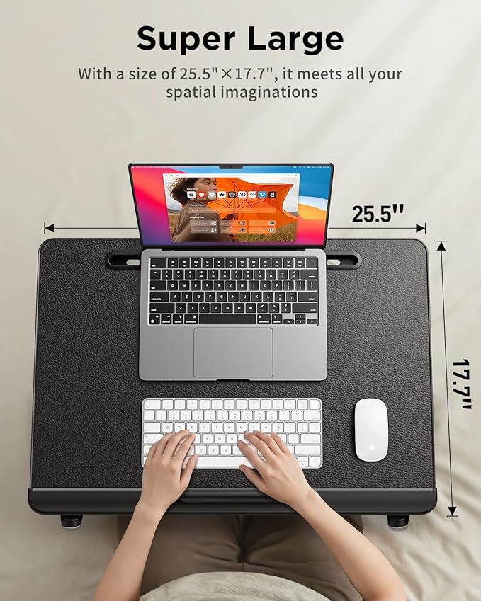 - [Extra-Large Desktop]: SAIJI laptop desk upgraded with a 25.5"x17.7" desktop.the extra large laptop lap desk will fit all you need. keep your laptop, textbook, mouse, and smartphone all within easy reach. It's wide enough to be comfortable working on a couch, on a bed, standing at a table, or even on the floor.