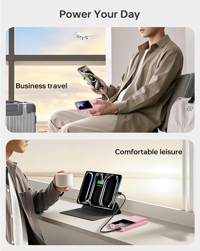 - Power Banks with Built-in Cables for Tangle-Free Charging: Say goodbye to cable clutter! Built-in USB C cable and iOS cable widely compatible with iPhone, Samsung, Android Phone/tablets and more smart devices. This portable charger eliminates the hassle of carrying a bunch of cables, making it the most powerful travel essential for you.** (a. Our product comes in a single pack b. Our product does not come with an AC plug.)**