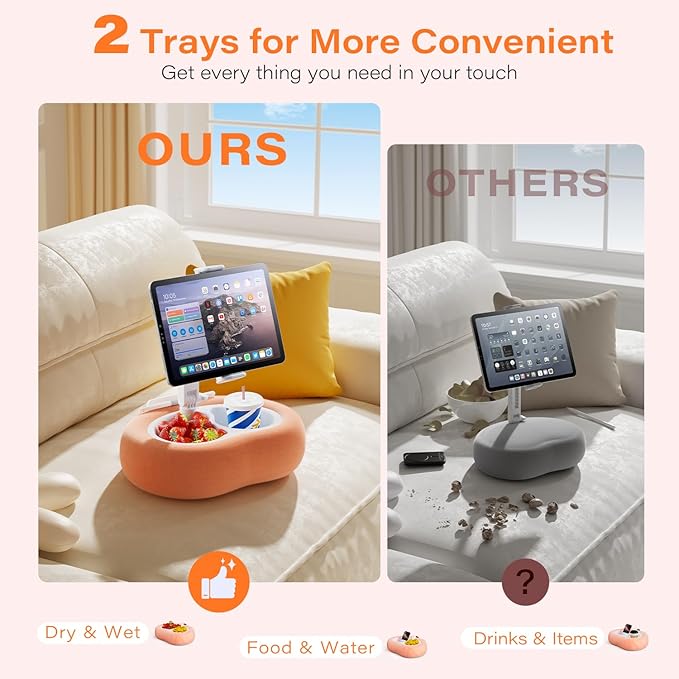 - 2 FOOD TRAYS, MORE CONVENIENCE: This kindle pillow stand features 2 separate trays, which can help you separate food from drink, food from phone, dry from wet food, and keep all these things neatly organized, offering you a cleaner, more organized experience. That iPad pillow with 2 snack trays can make your downtime more enjoyable by keeping everything you need at your fingertips whether you're reading on kindle, watching movie, or enjoying your favorite show